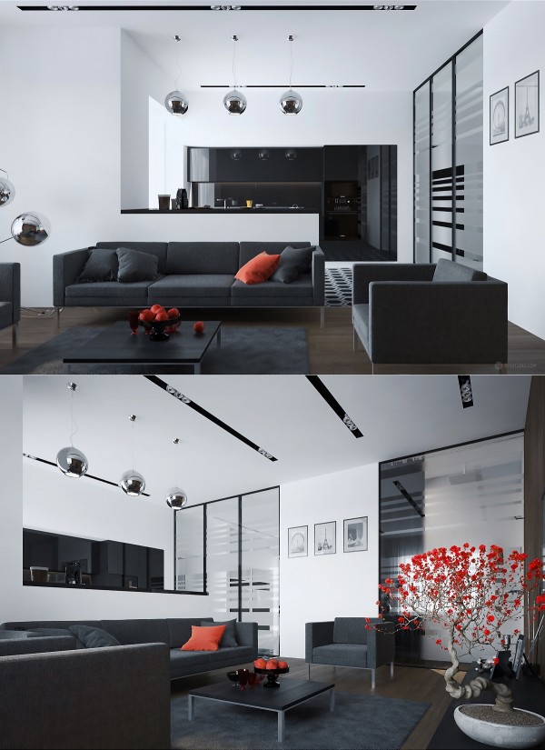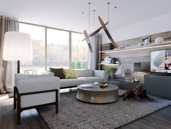 El tejado a dos aguas de esta elegante casa del visualizador Vizuall da al salón un poco de altura. Junto con el sofá bajo y anguloso y las modernas sillas de honda, el contraste crea interés visual a la vez que cumple su función práctica.