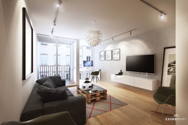 En el otro extremo del espectro tenemos este salón de madera clara y blanco. Es pequeño, pero suficiente para pasar una noche acogedora en casa.