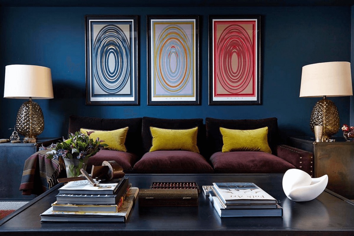 Otro esquema de decoración en azul oscuro, pero esta vez con un toque ligeramente inspirado en el arte pop gracias a los detalles en amarillo sol de alto contraste y los estampados gráficos de los cojines, las obras de arte y una alfombra geométrica que deslumbra a través de la tapa de cristal de una mesa de centro moderna de mediados de siglo. Observe cómo la decoración de la pared del salón combina a la perfección con la paleta del resto de la habitación.