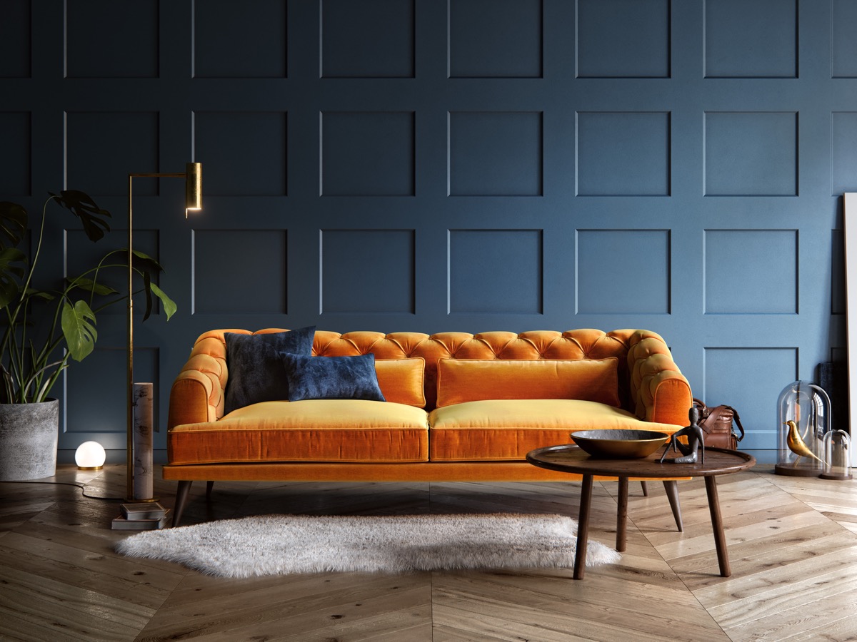 Un sofá Chesterfield naranja y una lámpara de lectura de pie dorada contrastan con el revestimiento azul noche.