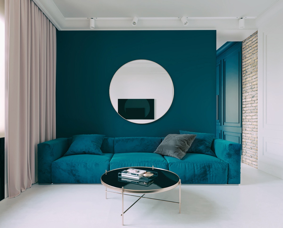 Este salón con sofá azul gana en interés al resaltar la forma inusual del sofá con un tono brillante.