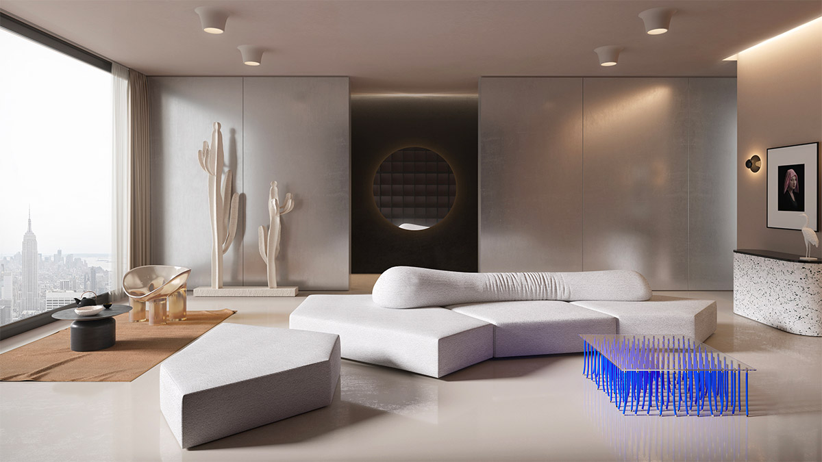 cristales teñidos de azul flanquean la habitación a ambos lados, reflejándose en el par de mesas de café de cristal del centro