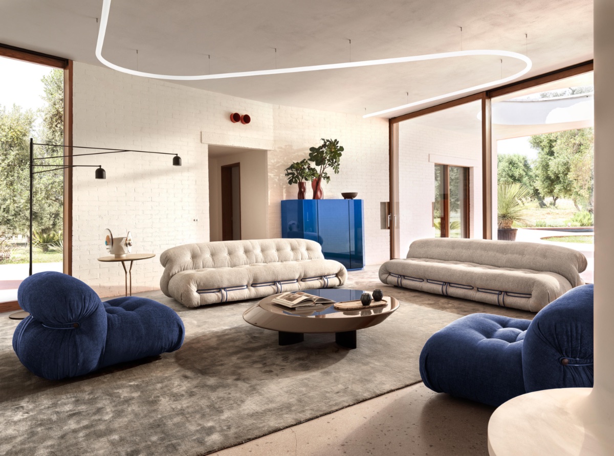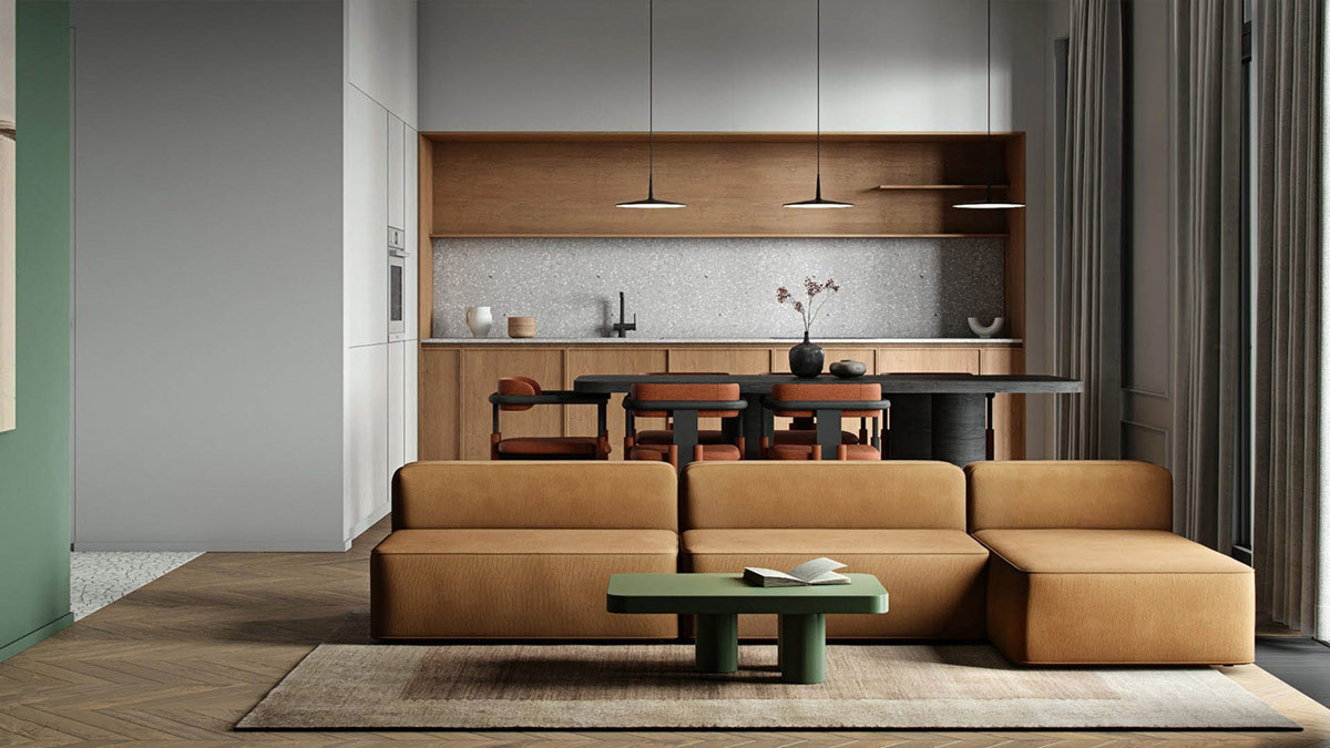 muebles contemporáneos en módulos azules y grises contrastados crean una estética elegante y con estilo.