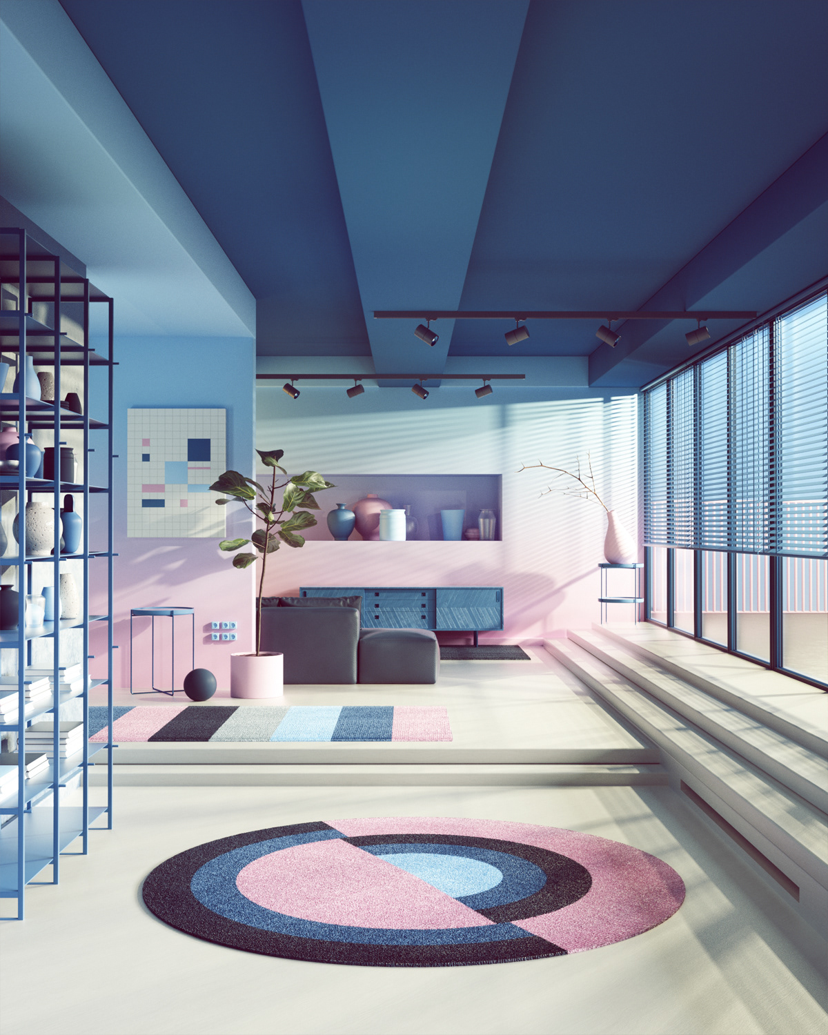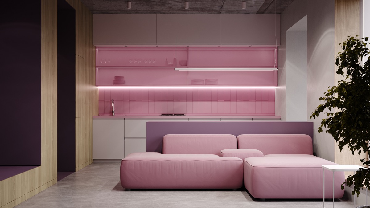 y verde azulado. Cada zona de este salón diáfano se ilumina con un toque de rosa. Los toques de verde azulado acentúan la dulzura.