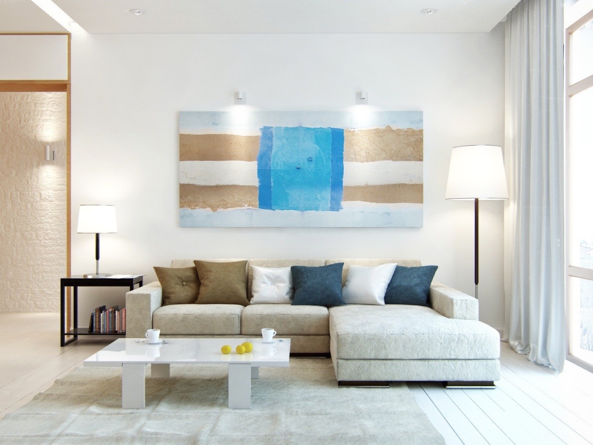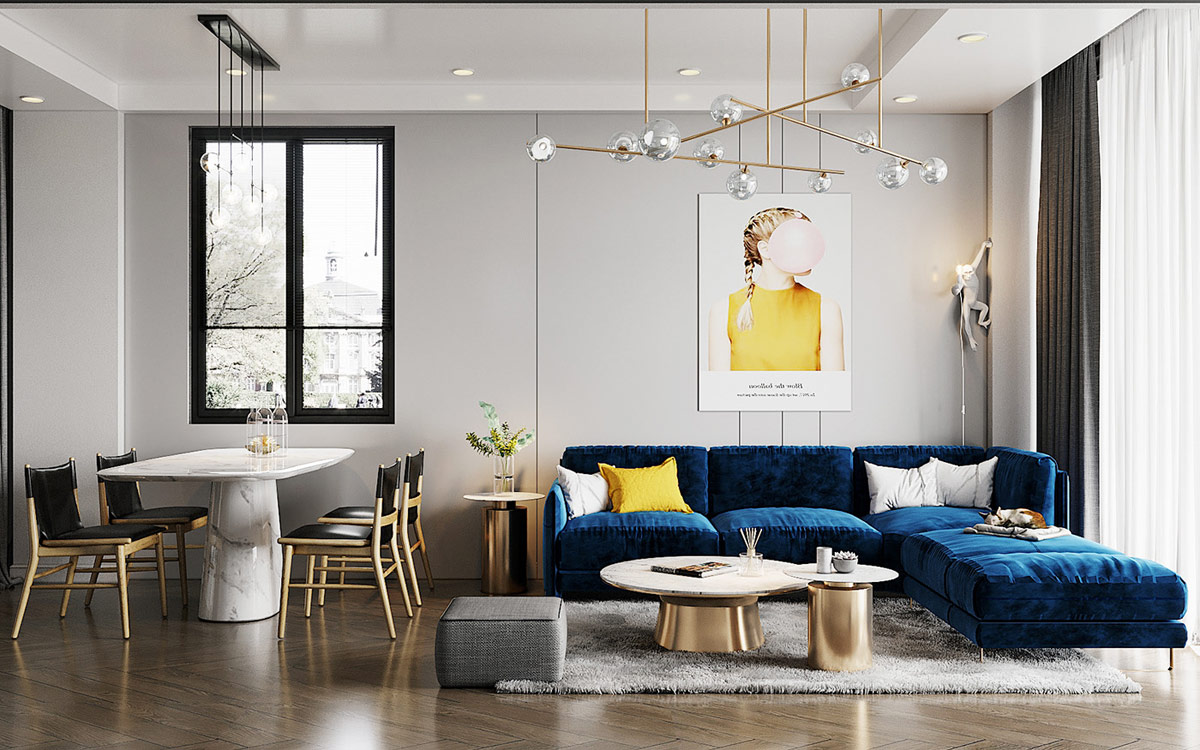 Decoración de acento en azul y amarillo. Un sofá azul llama la atención de inmediato en la zona de estar de un salón diáfano. Añade cojines amarillos en contraste y cuadros en la pared para dar vida al conjunto.