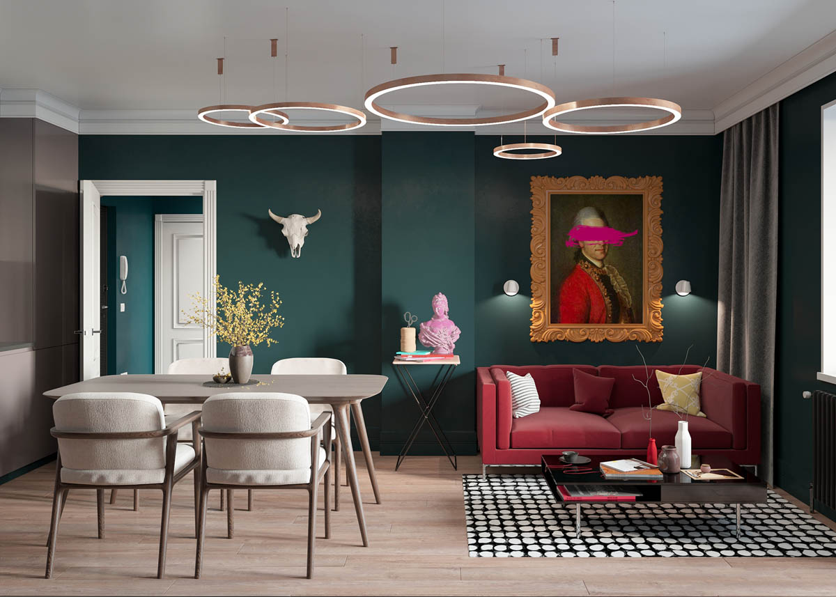 toque contemporáneo a una decoración clásica en verde y rojo con obras de arte extravagantes y una iluminación fabulosa.