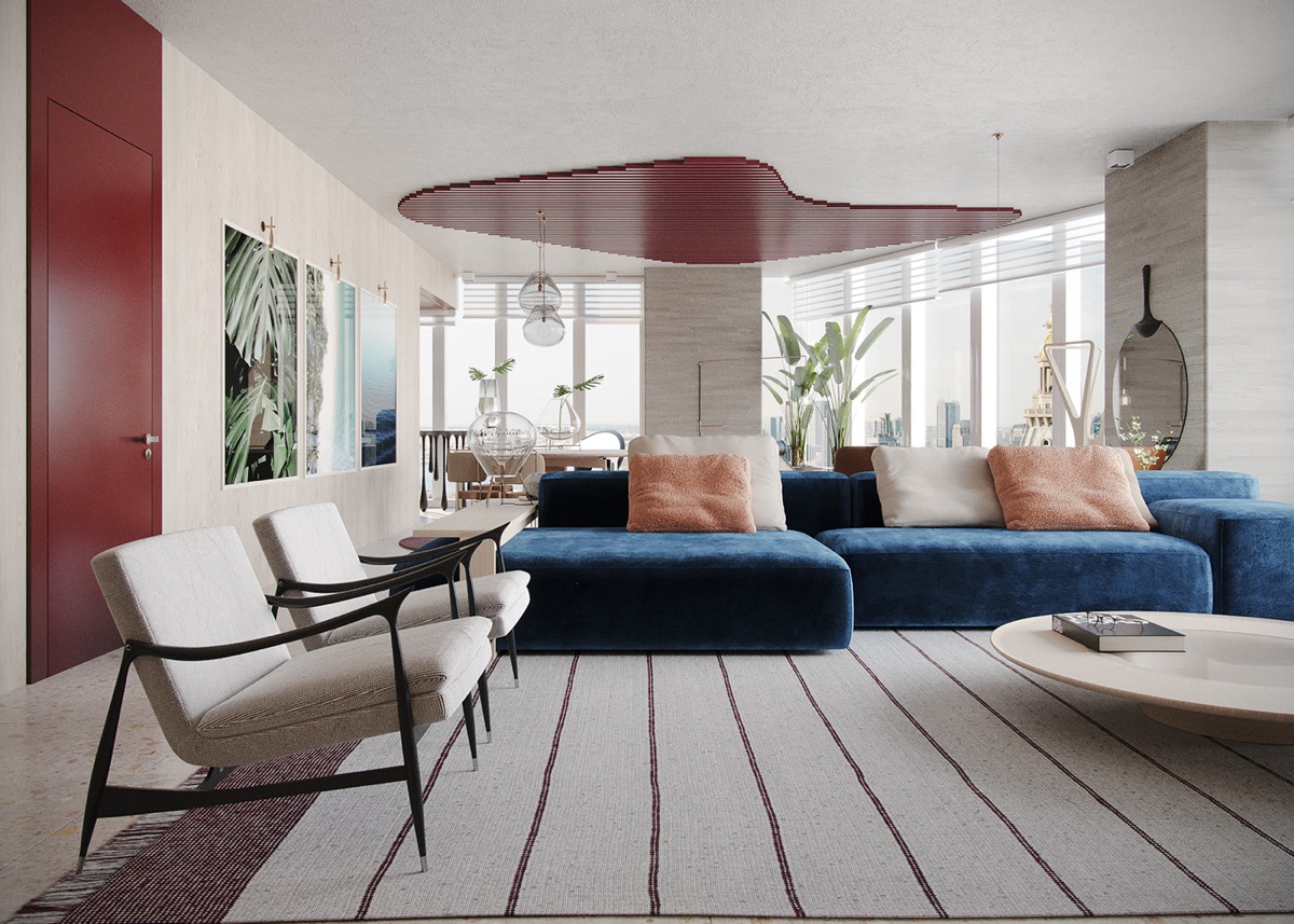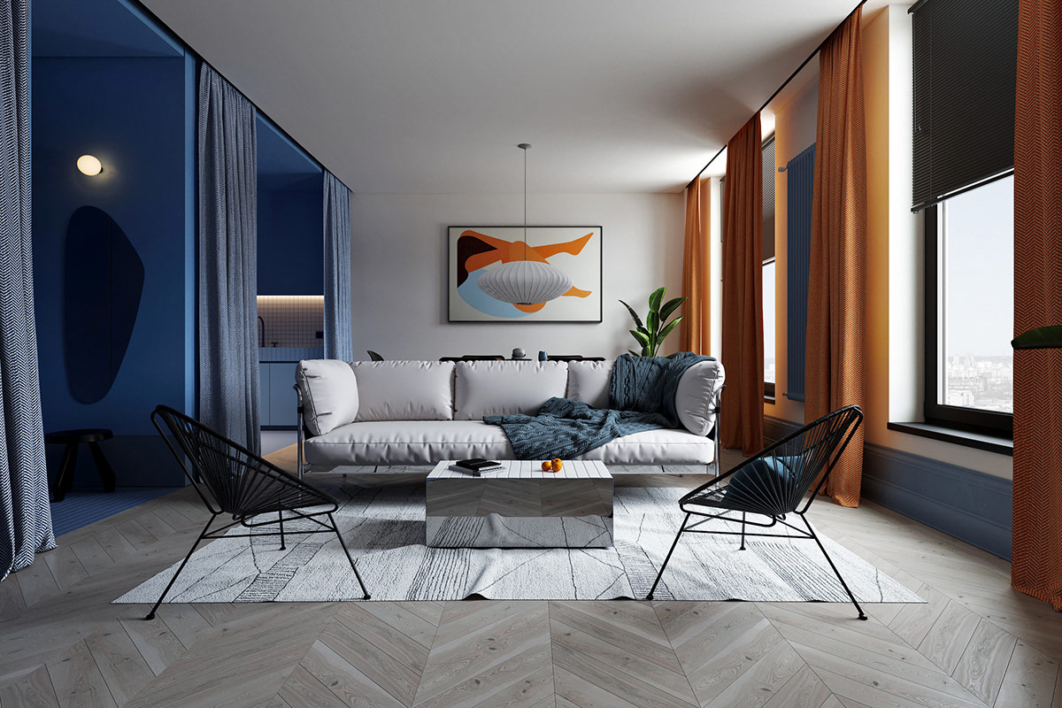 Azul y naranja quemado. Los toques de naranja quemado acompañan de forma brillante y controlada a la decoración azul del salón.