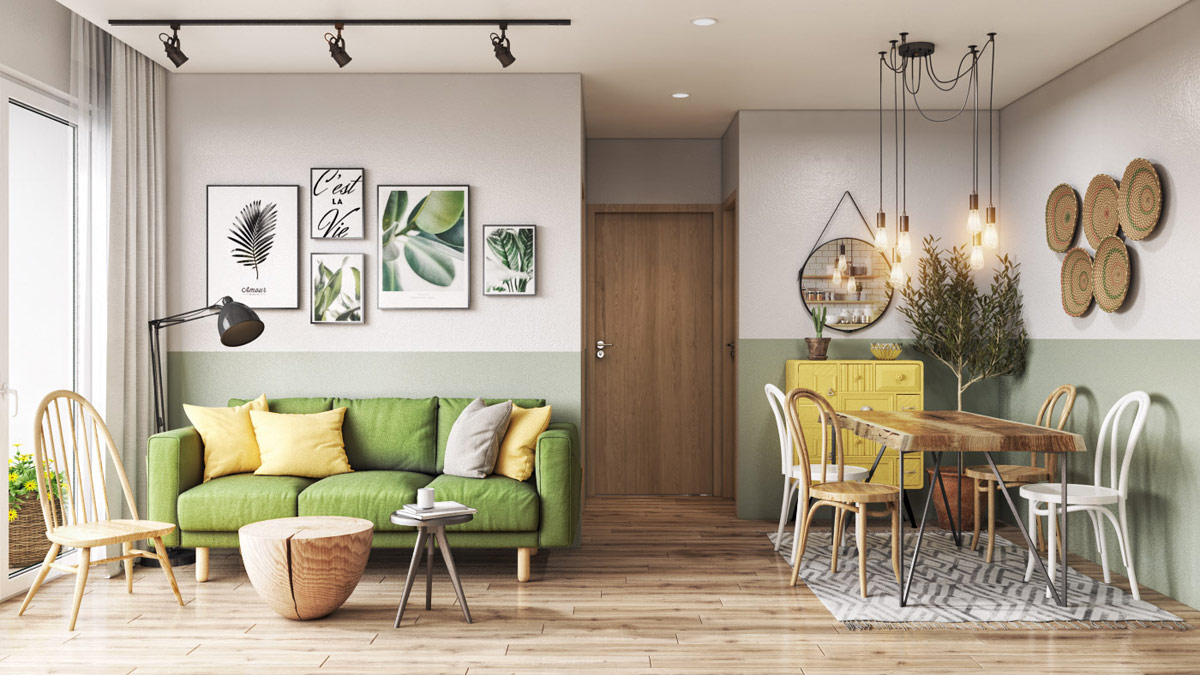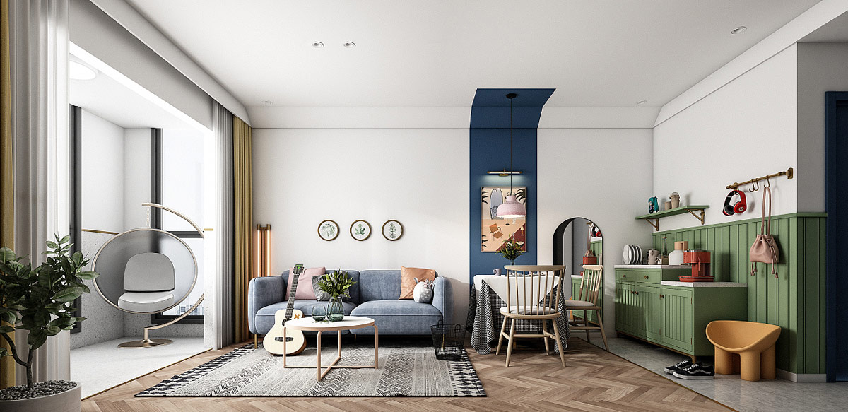 Los envolventes azul vaquero y verde crean una zonificación complementaria, muy útil en plantas