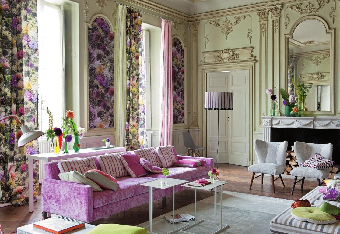 Los fabulosos paneles florales de boiserie rosa y pistacho no deben ser ignorados. Añada también un sofá fucsia a juego para conseguir el máximo impacto.
