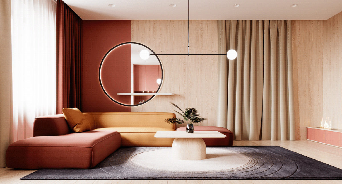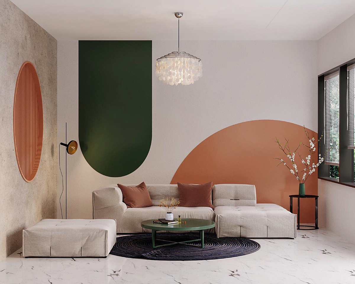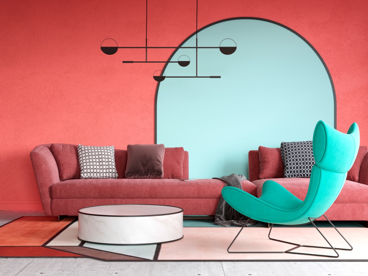 Geométricos en rojo y verde azulado. Si no te convence aplicar colores planos a las paredes, considera la posibilidad de añadir profundidad visual con diseños geométricos tonales. Estas introducciones en rojo y verde azulado crean ilusiones espaciales de punta a punta.