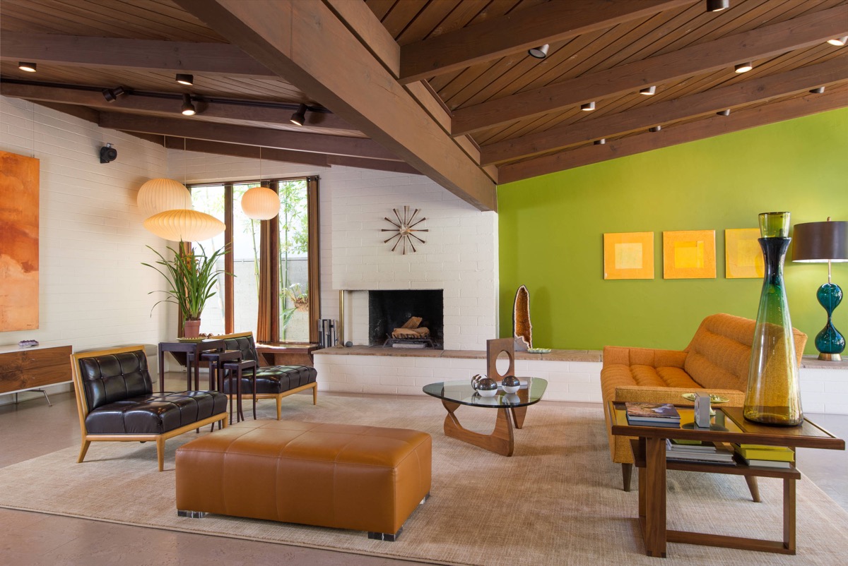 tono natural de la madera complementa un sofá marrón empenachado y una butaca Eames.