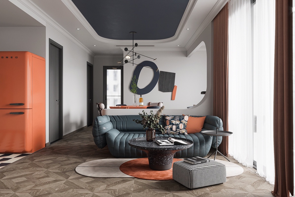 detalles en naranja sólido con elementos en azul grisáceo o azul petróleo para lograr una contradicción segura.