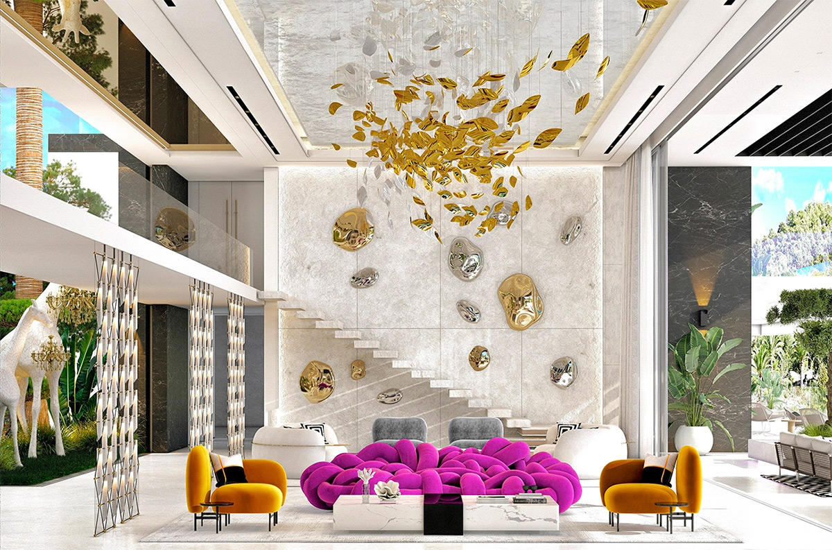 Deletrear fucsia y oro de lujo con muebles de diseño y una lámpara de araña espectacular sala