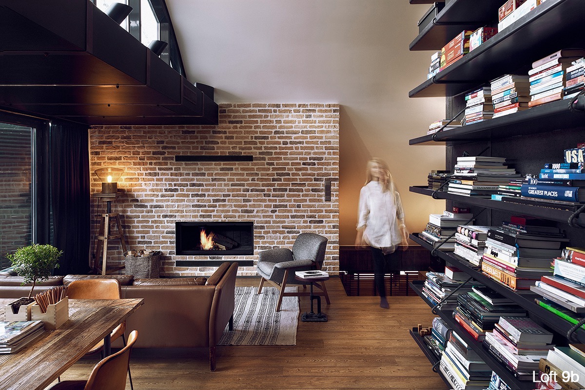 Lleva el aspecto rústico al siglo XXI. Utilizando toques de rojo para resaltar los espacios focales, dos láminas inclinadas, mesas de centro nido y una cabeza de ciervo montada en la pared atraen la mirada sobre el fuego. Los sofás de piel pasan de rígidos a relajados; las estanterías, de madera maciza a metal. Una columna de ladrillo visto y un balcón interior de hormigón añaden puntos de interés. Una araña metálica en forma de araña completa el look.