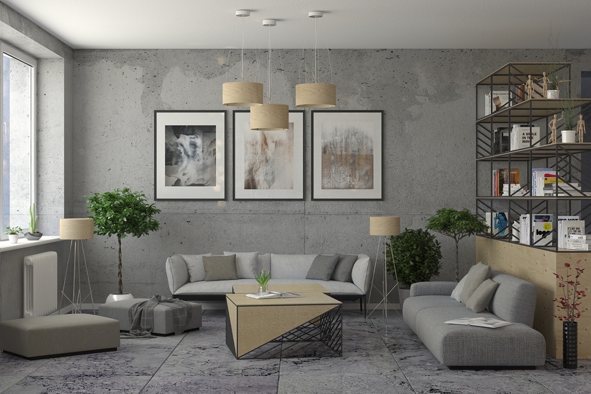 Añade confort a una habitación de hormigón. Lámparas y colgantes de arpillera beige se mezclan con sofás grises apagados y una mesa de centro mitad y mitad, uniendo ambos elementos.