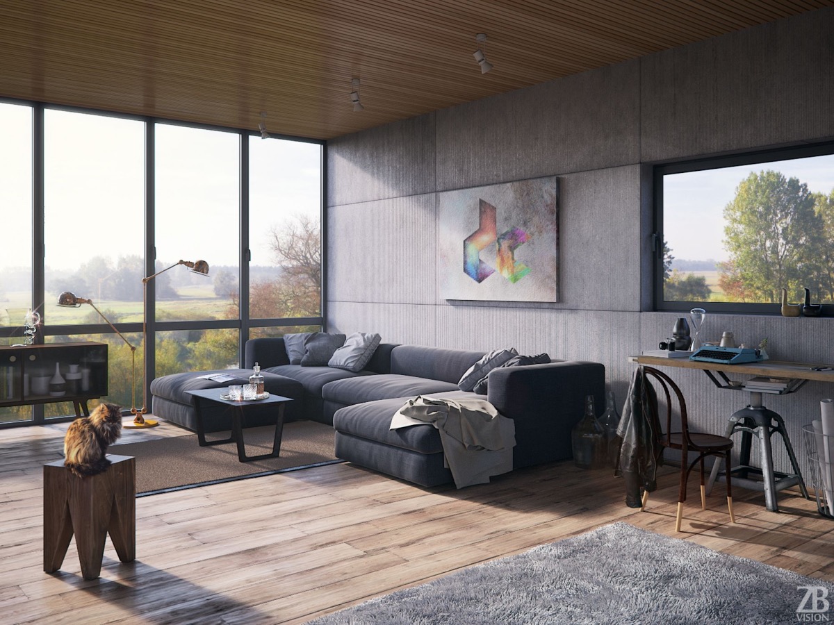 Para algo más oscuro y misterioso, este salón de hormigón tiene todas las bazas. Una hilera completa de ventanas de estación de tren iluminan una mecedora con una manta de piel, insinuando lujo. Las bombillas rectangulares en espiral se agrupan sobre muebles grises, de madera y metal, introduciendo la modernidad. Una cocina atrae con su vegetación.