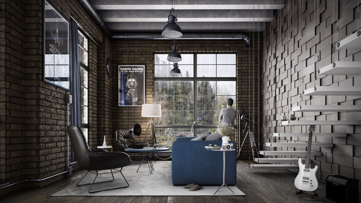 ¿Diseñando un piso de soltero? Este salón con paredes de ladrillo tiene todo lo que necesitas. Tres lámparas colgantes iluminan un grabado de Darth Vader, dos sillones de cuero negro, un gramófono y un telescopio, mientras una guitarra eléctrica blanca se esconde bajo la escalera. Empapada de blanco, una escalera flotante imita las vigas del techo y el color de la alfombra.