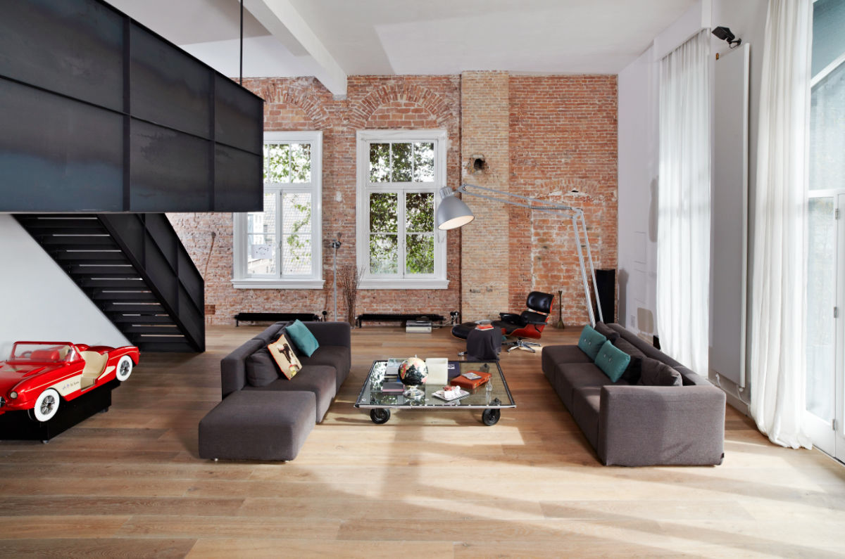 Luminosa, clara y limpia, esta sala de estar alberga a toda la familia. Los altos techos de ladrillo visto están enmarcados por amplios techos blancos, cortinas de gasa y ventanas de estilo francés. Un balcón interior metálico y una escalera destacan sobre un coche de carreras al rojo vivo, mientras que una mesa de centro de cristal con ruedas y un sillón reclinable naranja y negro añaden comodidad con una diferencia.