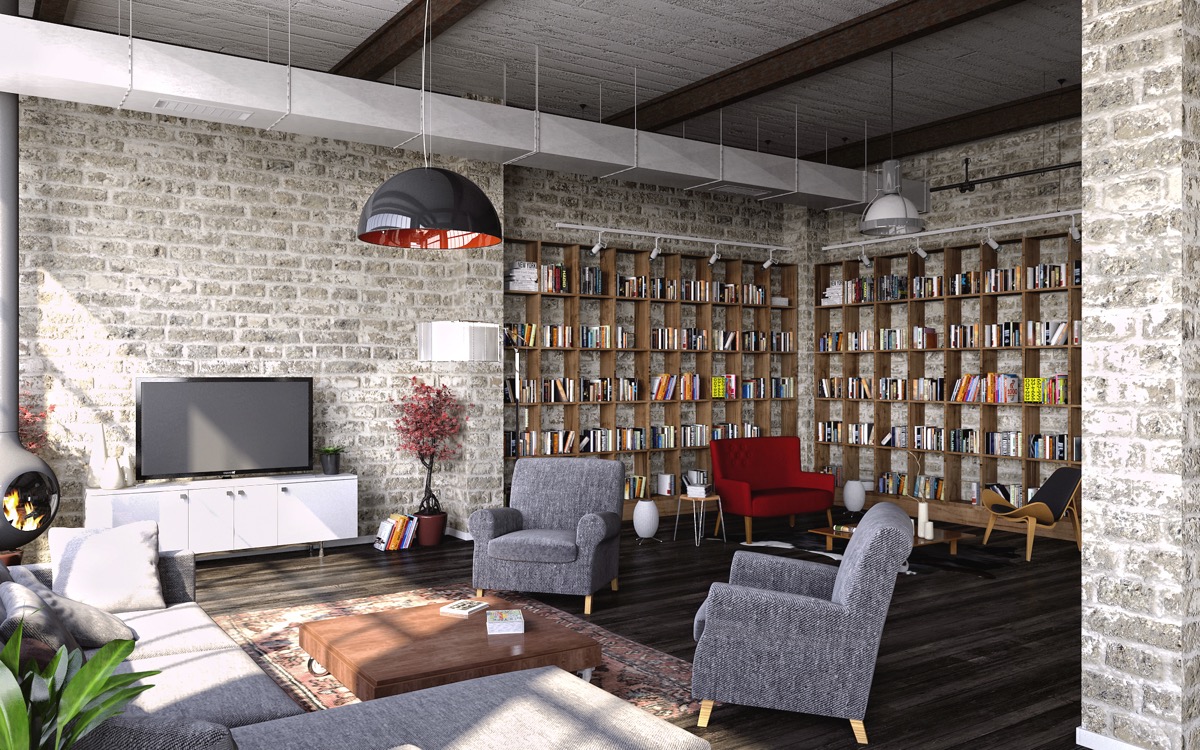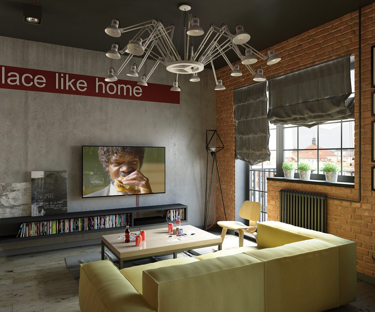 ladrillo visto tradicional y las paredes de hormigón lucen una calcomanía tipográfica y armarios para DVD con las últimas pantallas.
