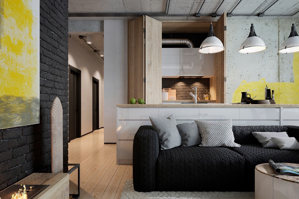 Un salón industrial no tiene por qué ser marrón y gris. Este espacio más pequeño aporta una pizca de limón, que forma abstractos y un gato escurridizo en la cocina. Un sofá acolchado negro ofrece comodidad ante el ladrillo pintado del mismo tono. Los suelos de madera clara crean calidez entre el hormigón y el gris, mientras los invitados se dirigen a una moderna chimenea de panel.