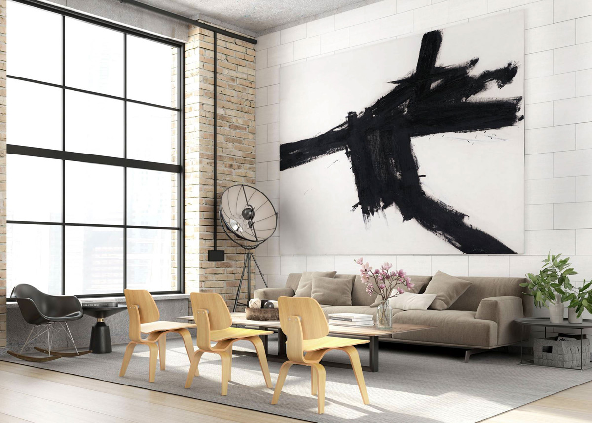 Utiliza elementos industriales para enmarcar un cuadro llamativo. Las paredes de ladrillo visto, las ventanas de fábrica y los muros de hormigón de este salón ofrecen suficiente espacio limpio para un monocromo dramático.