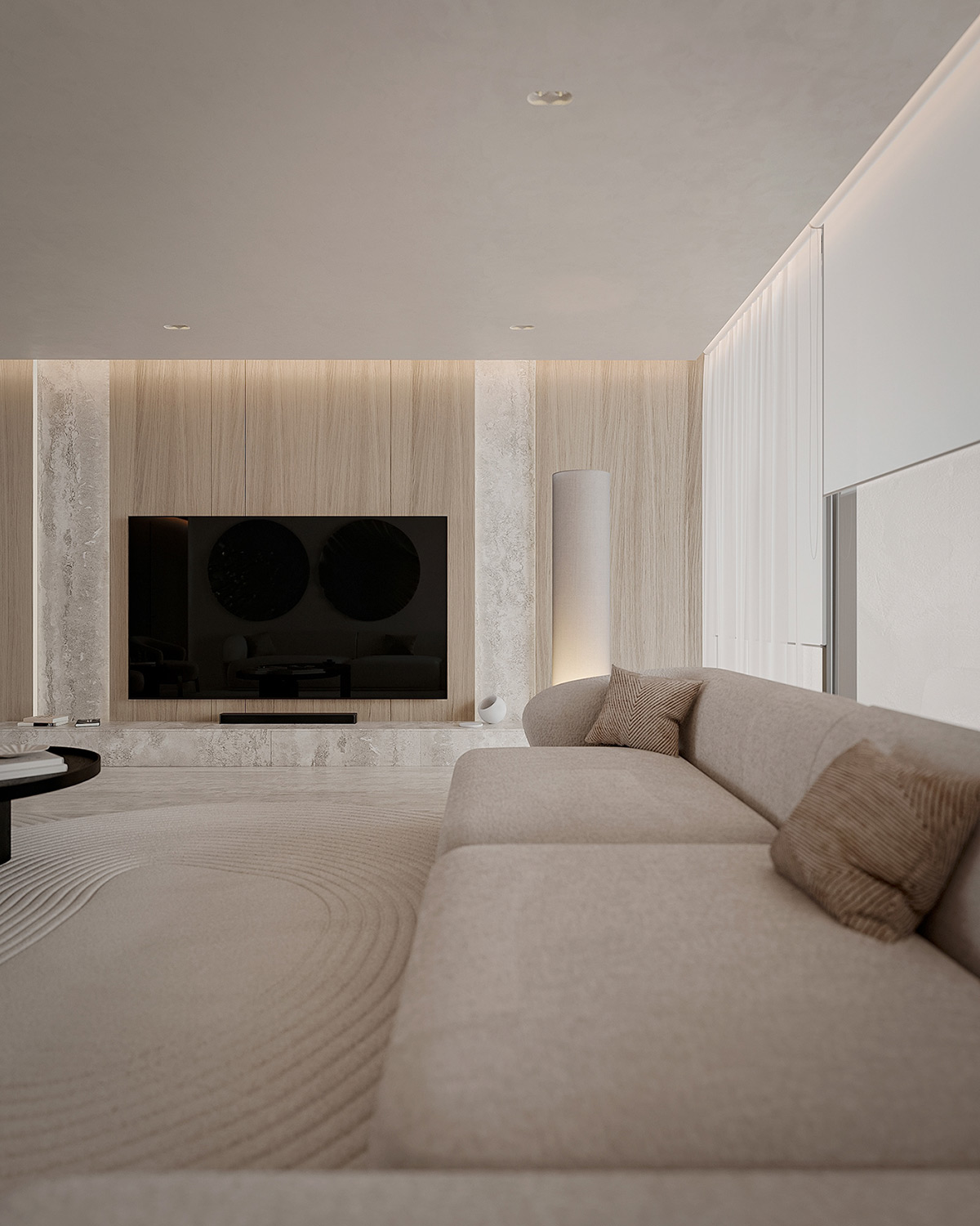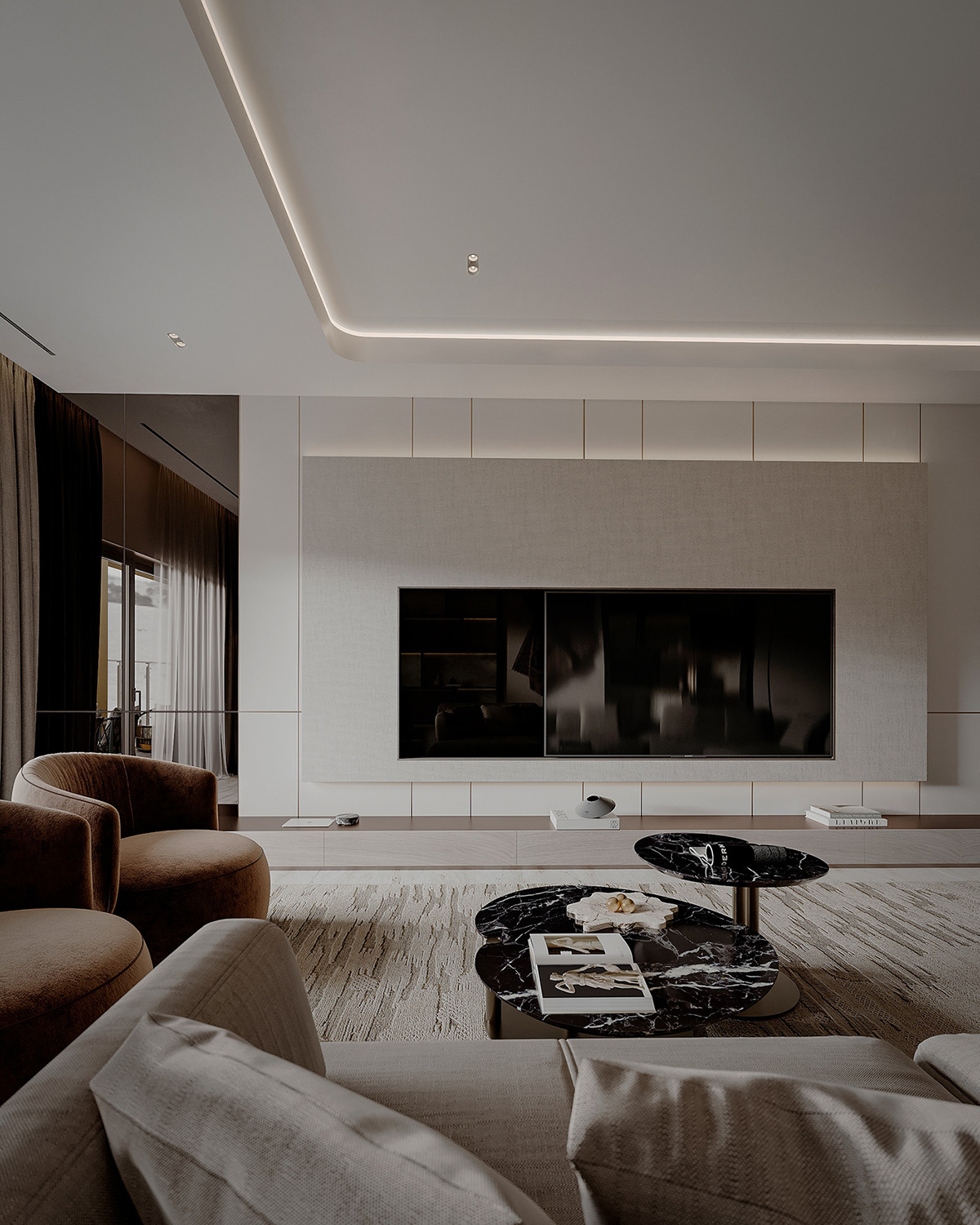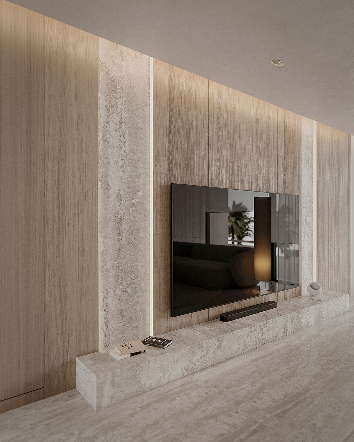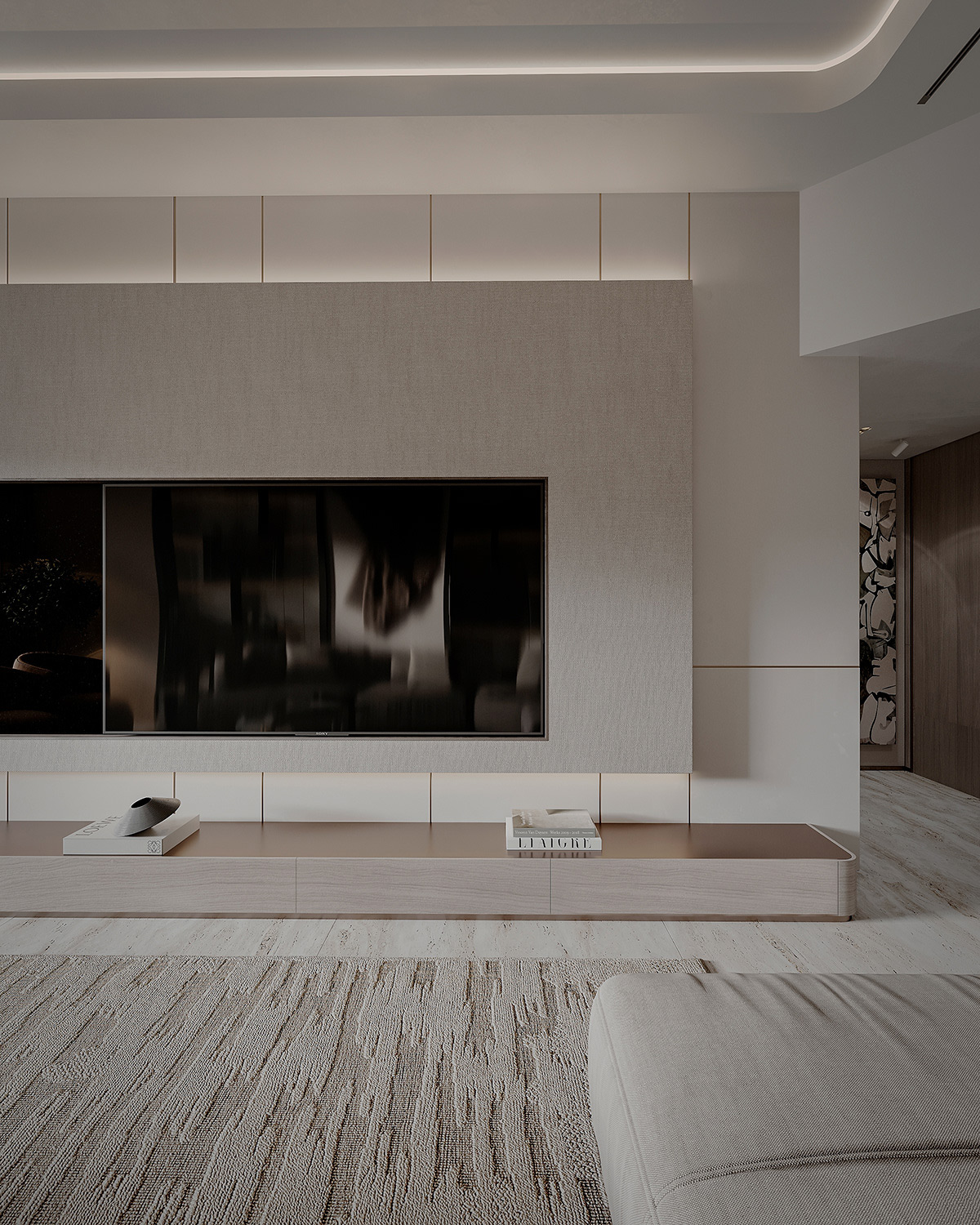 El mueble bajo para los medios de comunicación está redondeado en sus esquinas para dibujar una silueta suave como la seda, que se complementa con el contorno del techo.