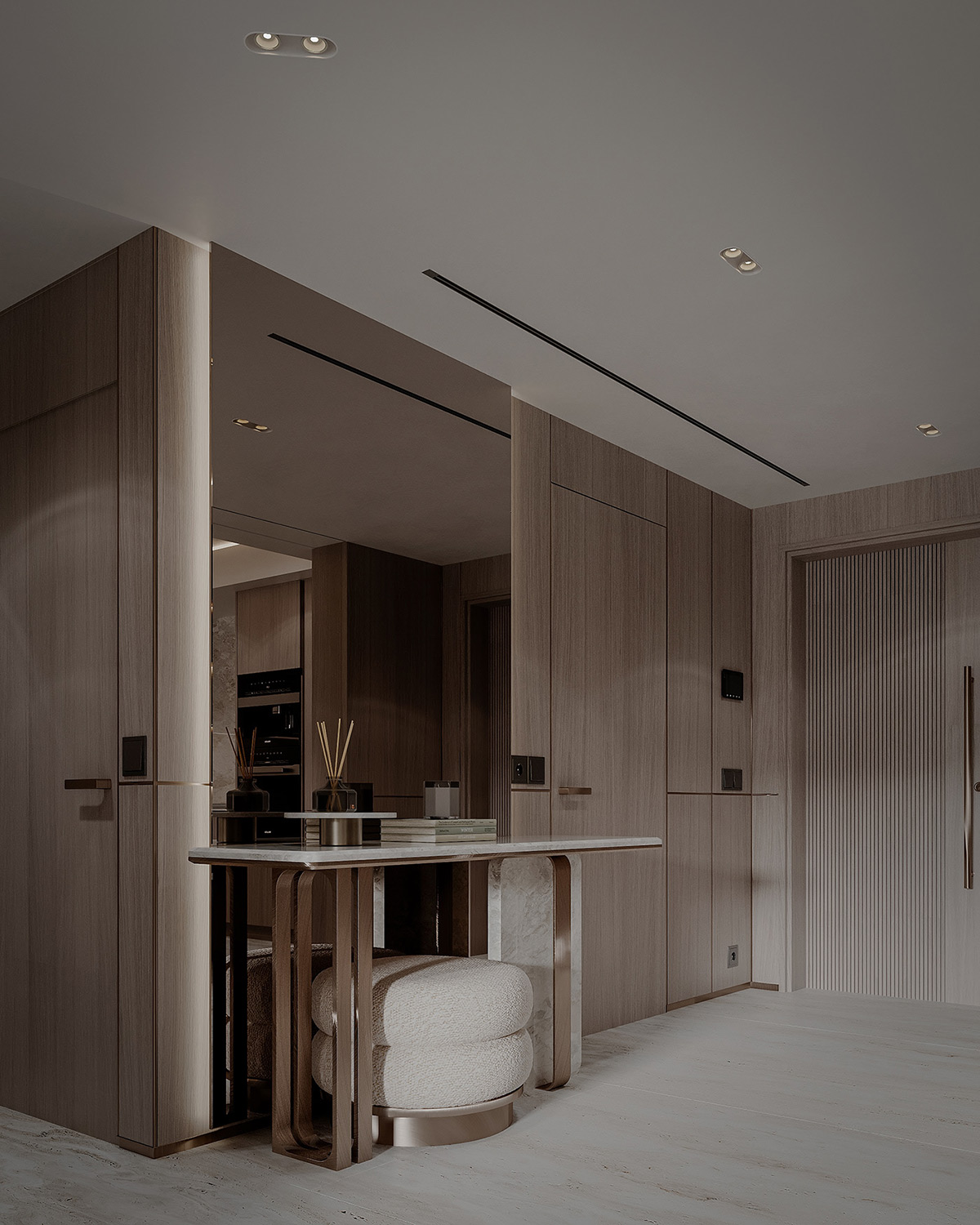 Los paneles de madera cubren la esquina de la habitación, dirigiendo la mirada hacia la entrada de la casa. En el pasillo, un zócalo de arte en piedra repite la elegante estética de la