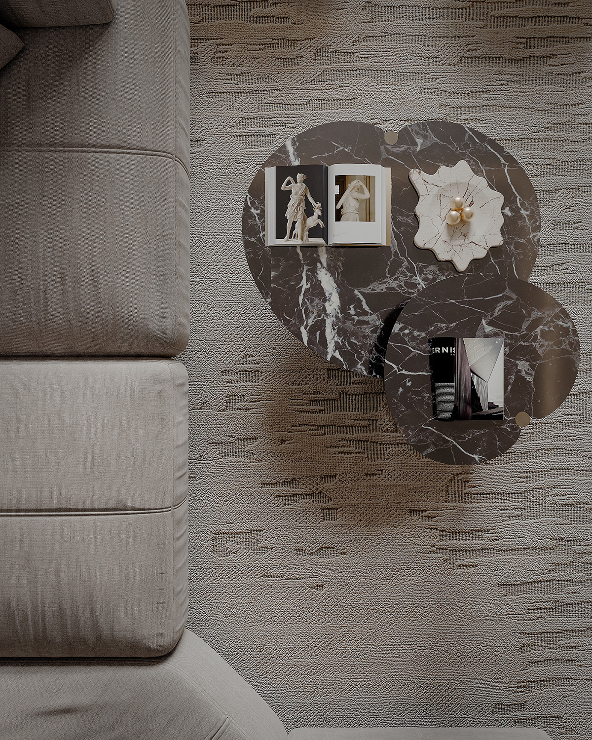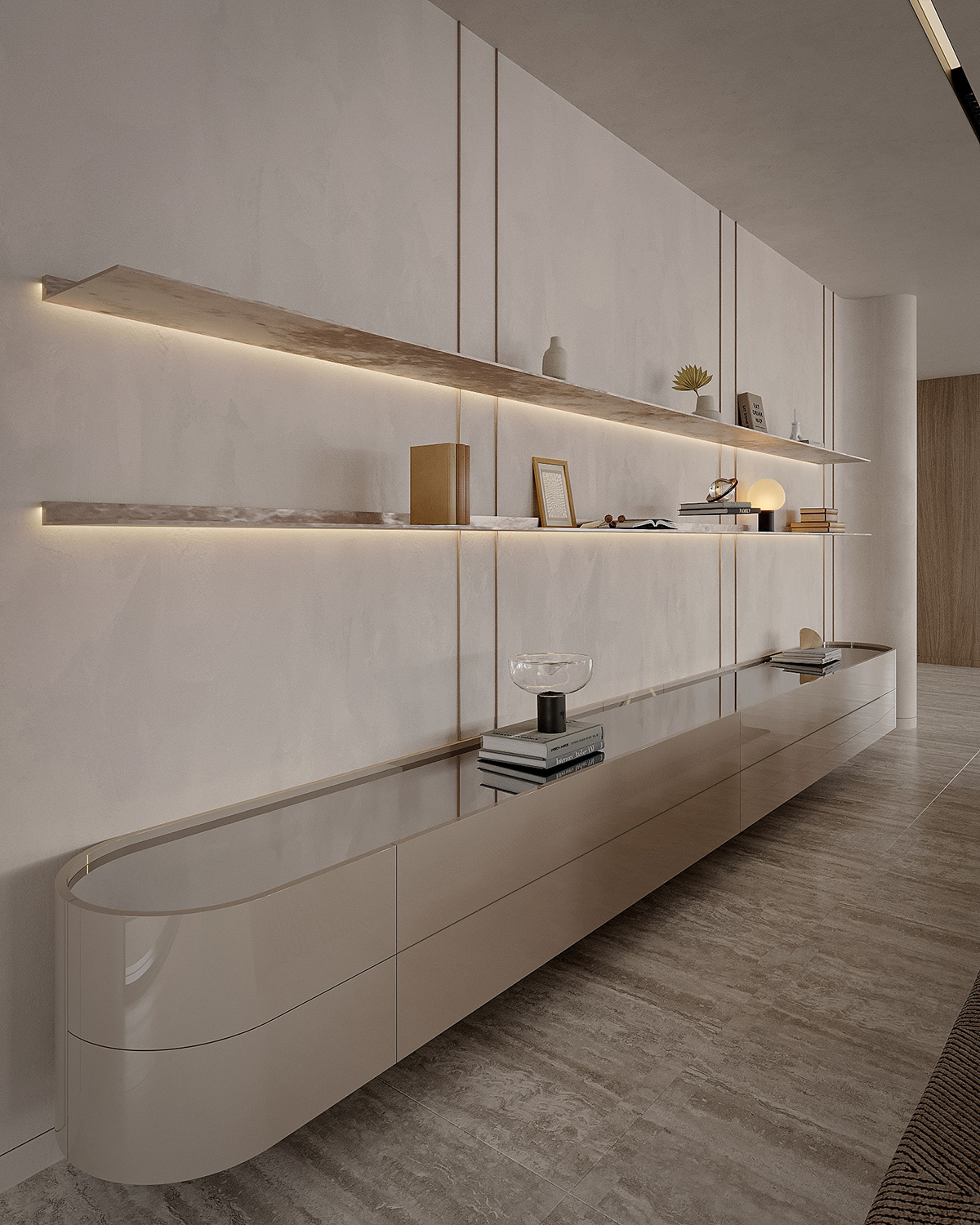 Unas estanterías flotantes brillan sobre el estuco beige de la pared, sosteniendo una refinada variedad de objetos decorativos y algunos libros. Debajo hay una consola en forma de cremallera que añade un elemento beige brillante que refleja el ambiente.