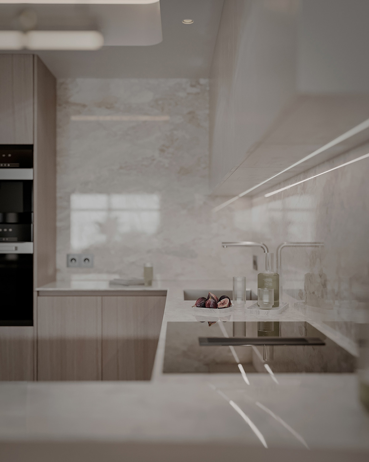 revestimiento de mármol beige de la cocina enlaza con el impresionante suelo del salón.