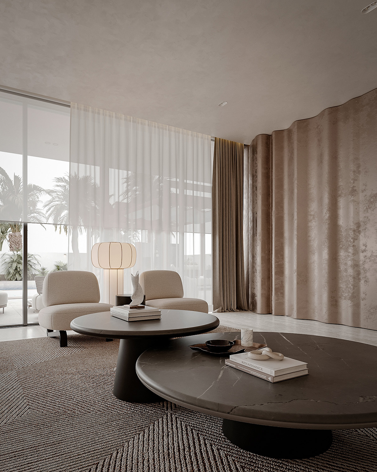 Unas mesas de centro de mármol negro añaden un acento oscuro frente al sofá, dando a la sala de estar un núcleo audaz.