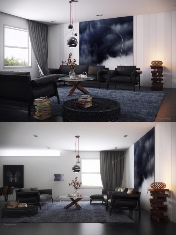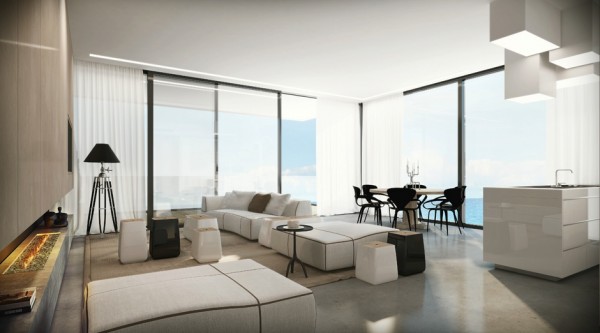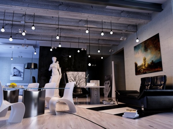 Esta sala de estar ultramoderna juega con el tema del blanco y negro, aplicándolo al mobiliario y a los revestimientos del suelo.