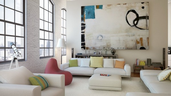 Este moderno salón tipo loft utiliza colores claros (desde las paredes hasta la mesa de centro tipo otomana) para reflejar y llamar la atención sobre la luz del sol que entra por las enormes ventanas. Pequeños toques de color añaden calidez sin resultar demasiado atrevidos.