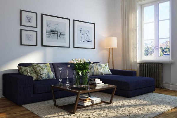El gran sofá seccional de este salón es fácil de reclinar desde cualquier ángulo. Una mesa de centro baja y una lámpara de salón alta crean interesantes niveles verticales.