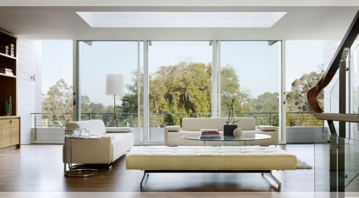 El arquitecto John Maniscalo creó esta casa contemporánea en torno al máximo aprovechamiento de la luz natural. Con su pared retráctil de ventanas y su gran claraboya abierta, esta sala de estar parece flotar entre los árboles.