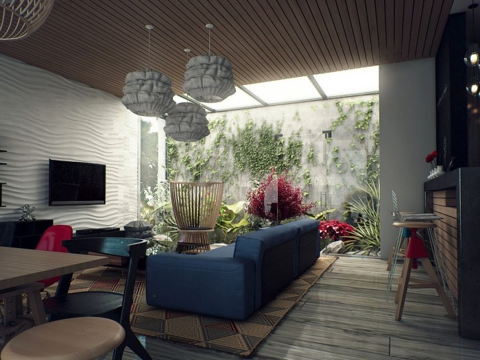 Un hermoso patio lleno de enredaderas trepadoras, plantas de colores brillantes y diversos tonos de vegetación cobra vida gracias a una claraboya y las ventanas de cristal que la acompañan. Los elementos de diseño natural del espacio se funden orgánicamente con el jardín interior y el exterior.