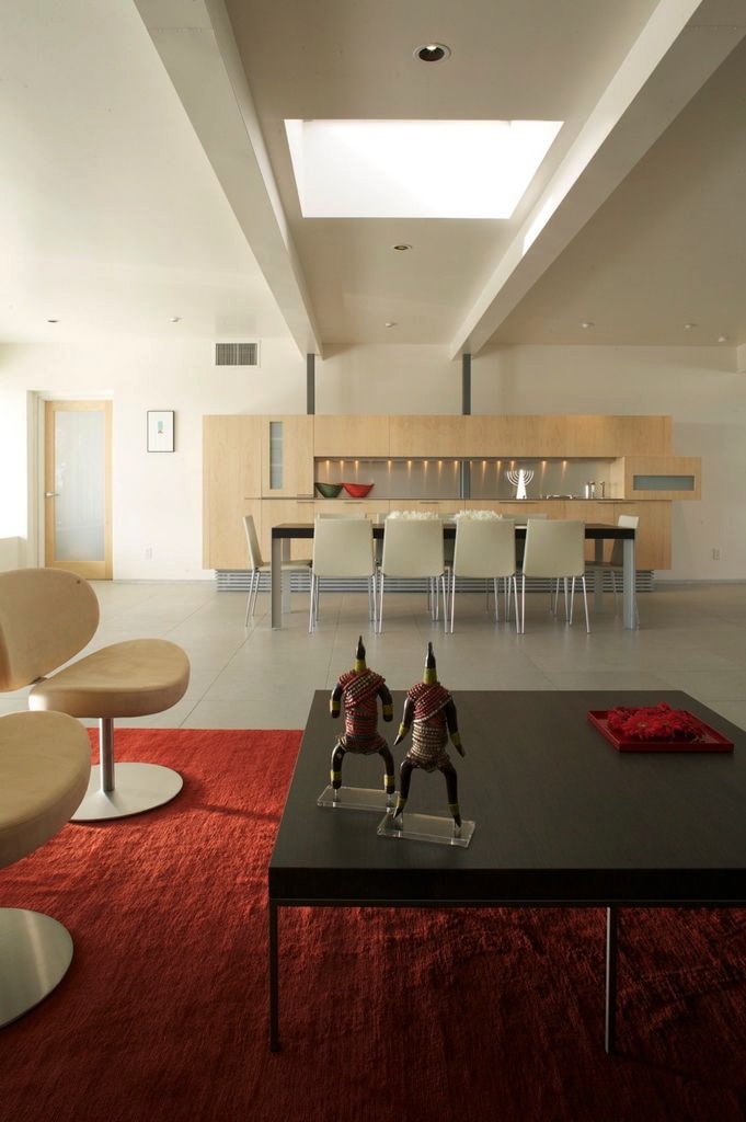 Pensando en el máximo aprovechamiento de la luz natural, los diseñadores de Artenid crearon esta casa contemporánea con una pared de ventanas en el salón y un entramado de claraboyas a lo ancho de la habitación.