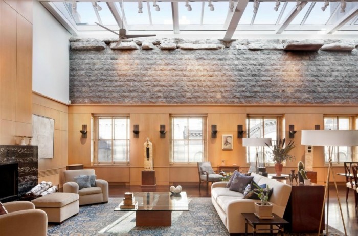 Un ático de cuatro dormitorios en TriBeCa cuenta con techos de claraboyas que se extienden a todo lo ancho y largo del espacio de concepto abierto.