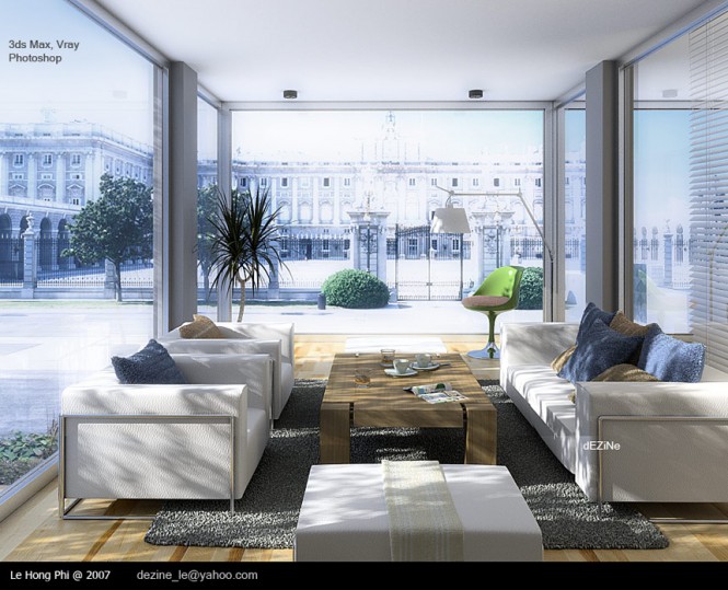 Los colores yuxtapuestos dan dimensión a este gran salón, mientras que la ligereza que le confiere la amplitud del espacio.