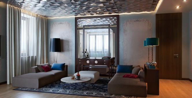 Este esquema neutro recibe un golpe de glamour de una gran lámpara de araña en lo alto y brillantes cojines de bronce dispersos por todo el perímetro.