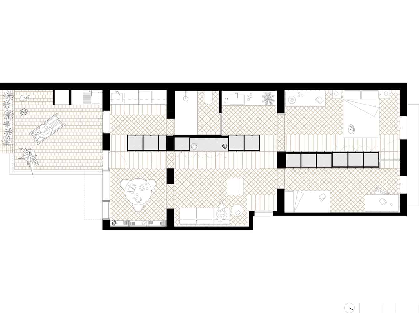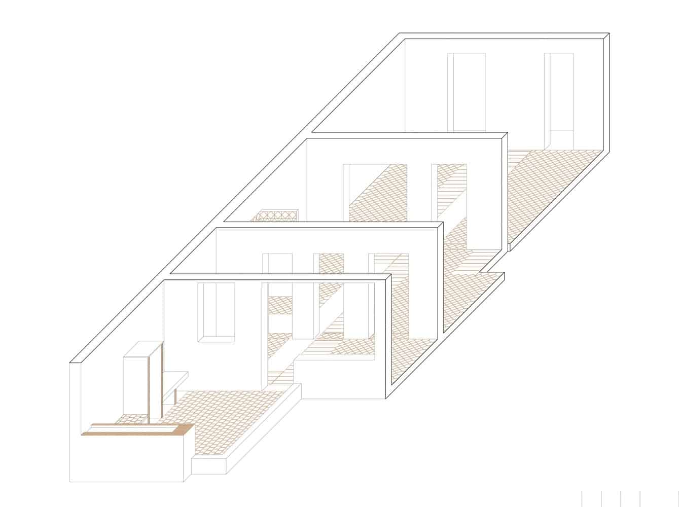 El proyecto se enfoca en una única estrategia, abrir el piso longitudinalmente. Este se concentra en un solo gesto, lograr conectar visualmente la calle y el patio interior, uniendo las fachadas opuestas y, hasta ahora, distantes.