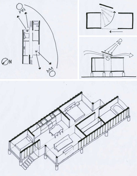 Los contenedores centrales se escalonan para proporcionar un acceso selectivo a la luz solar natural y la ventilación. Se puede inclinar aún más la altura de la casa para mejorar la refrigeración pasiva del hogar. La pintura y los dibujos son representaciones directas de espacios  minimalistas, y el resultado es  atractivo y mucho muy barato.