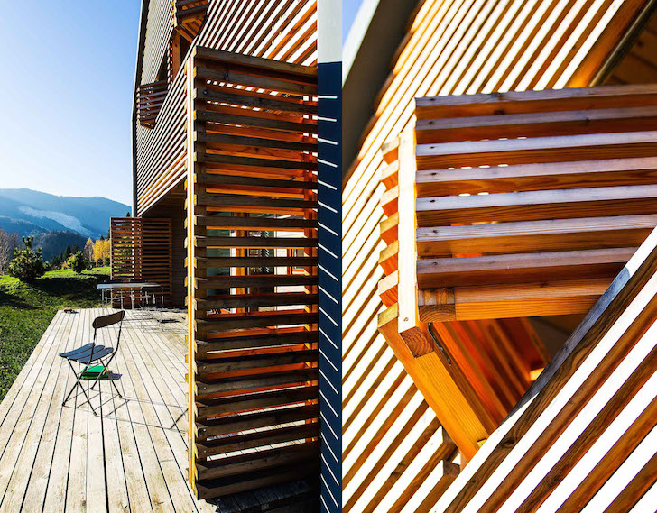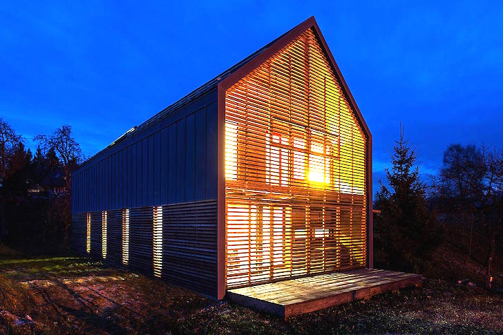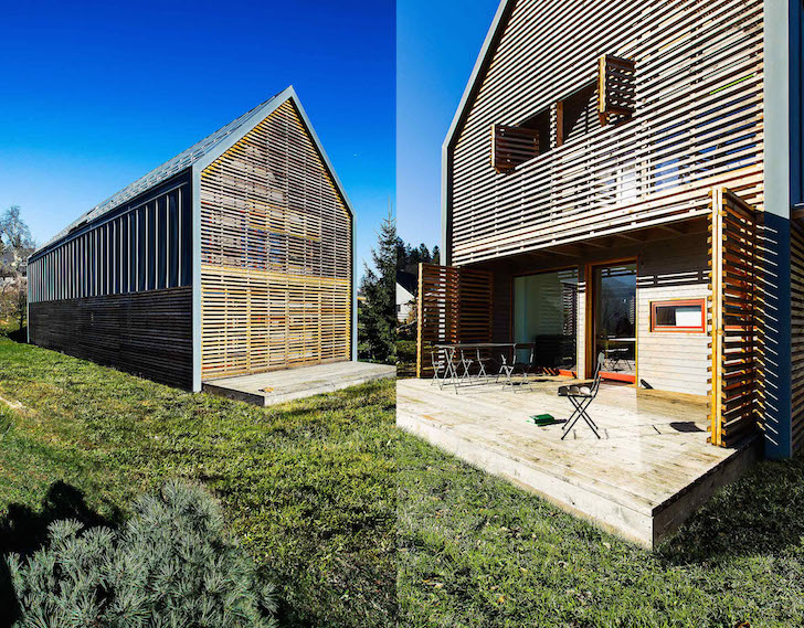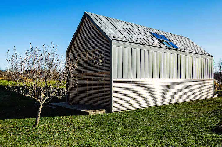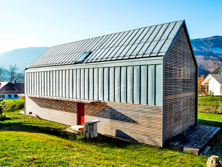 El diseño de esta casa unifamiliar puede parecer una granja tradicional, sin embargo viéndola más de cerca es una casa prefabricada moderna. Ha sido construida en medio de un paisaje abierto en la ciudad de Radovljica, Eslovenia.Es una casa para una escapada de fin de semana construida con un marco de madera prefabricada cubierta con paneles solares para poder reducir la huella ambiental y los costos de mantenimiento que es lo que se busca hacer.