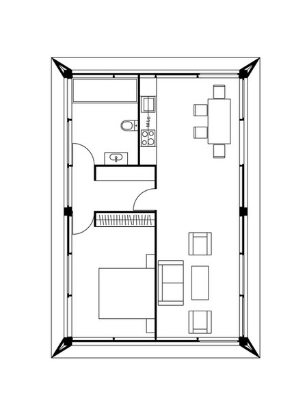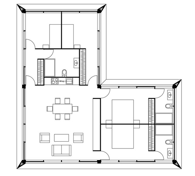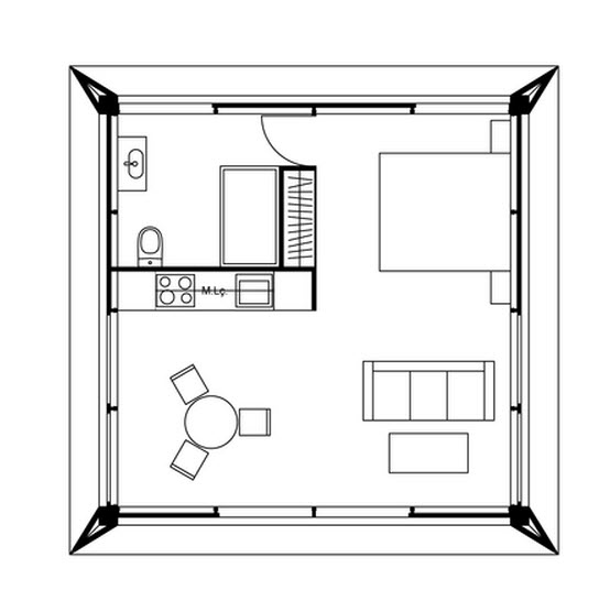 Si lo que estamos buscando es privacidad, este segundo modelo de casa te puede interesar ya que se han separado mediante los ya mencionados paneles de madera prefabricados la zona privada y social, haciendo que de esta forma la cocina y la sala comedor queden ubicadas en una zona área y el dormitorio finalmente quede separado.