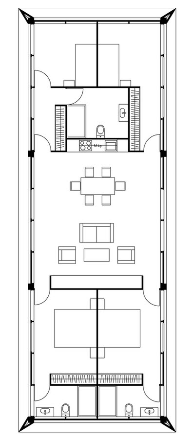 Si lo que tenemos es un terreno largo, esta es una importante y moderna zonificación para tu vivienda. En este último plano divisaremos cuatro dormitorios en los extremos y en la parte central la zona social.
