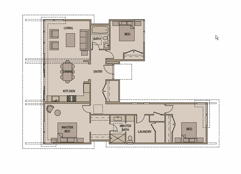 Este es el plano de la casa prefabricada. Cuenta con tres habitaciones, siendo una de ellas la habitación principal que cuenta con su propio baño dedicado. La sala y comedor comparten el mismo espacio logrando amplitud, y muy bien planeado, la excelente luminosidad y vista excelsa hacia el paisaje exterior.