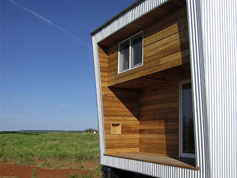 Revestimiento de metal corrugado añaden algunos destellos de material a lo largo de los lados largos de esta estructura, al mismo tiempo listones de acabado natural de madera añaden contraste en un extremo.