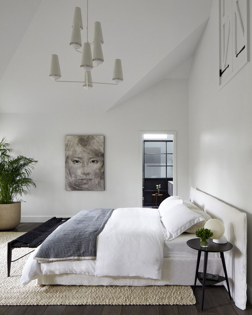 8 Opta por una Cama Plataforma. La cama plataforma elegante y moderna tiene un perfil bajo en este dormitorio que la diseñadora Elaine Santos dice que «tiene suficiente arquitectura para que los muebles y los textiles puedan permanecer en silencio». Si tienes techos altos en tu propio dormitorio, prueba con una lámpara de araña escalonada como esta de Circa Lighting.