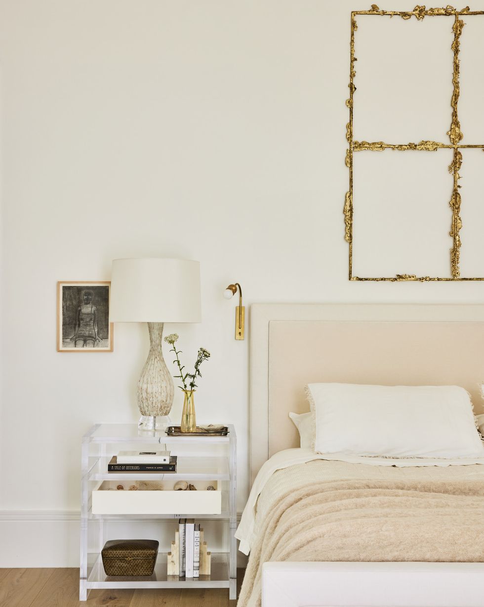 5 Ilumina las Cosas con Lucite. Transparencia total: nos encanta una pieza de acento de lucite para modernizar espacios pequeños, como la mesa auxiliar en este dormitorio diseñado por Kristin Fine. Las luces de mesita junto al cabecero son un pequeño toque de lujo también.