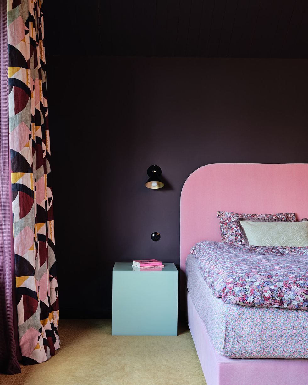 7 Prueba con Motivos Geométricos. Este dulce dormitorio diseñado por Atelier ND brinda una lección de geometría, con colores de corazones de conversación en la mesita de noche cúbica, el cabecero curvado y el marco ordenadamente cuadrado. El tema continúa en las cortinas con estampado geométrico.