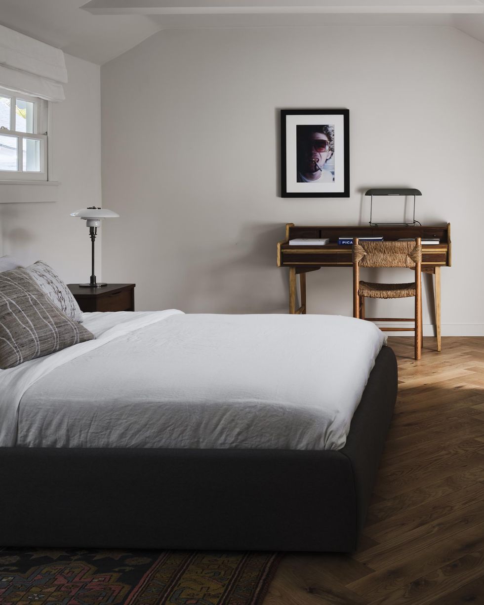 18 Enmarca Fotos Contemporáneas. Probablemente no has tenido un póster colgado en tu habitación desde la universidad, pero ¿qué tal enmarcar una obra de un icono para darle un toque juvenil? Esta foto de Dash Snow sobre el escritorio da al espacio diseñado por Studio OSKLO un ritmo contemporáneo. El dormitorio también cuenta con una lámpara francesa de mediados de siglo y una cama personalizada en lana de mohair en tono de franela.